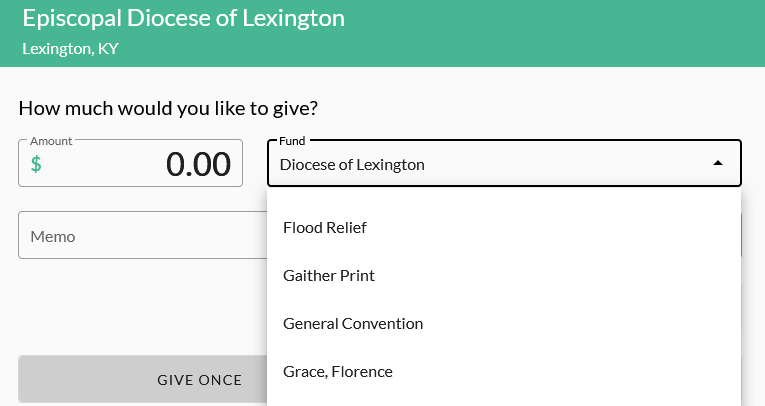 Thank you for your donation to Grace Episcopal Church in Florence KY. When submitting your donation, remember to select the dropdown menu under "Fund" and change the subject to Grace, Florence. Your donation is greatly appreciated.